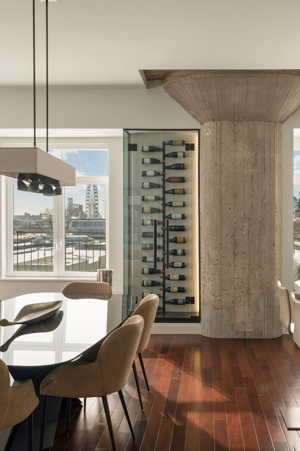 Located in the heart of the Old Port of Montreal, the Heritage Project reimagines a beautiful historic condo with a refined, modern sensibility. The building’s striking concrete pillars became a central design feature, celebrated rather than concealed, allowing their character to stand out while blending seamlessly into the overall aesthetic.