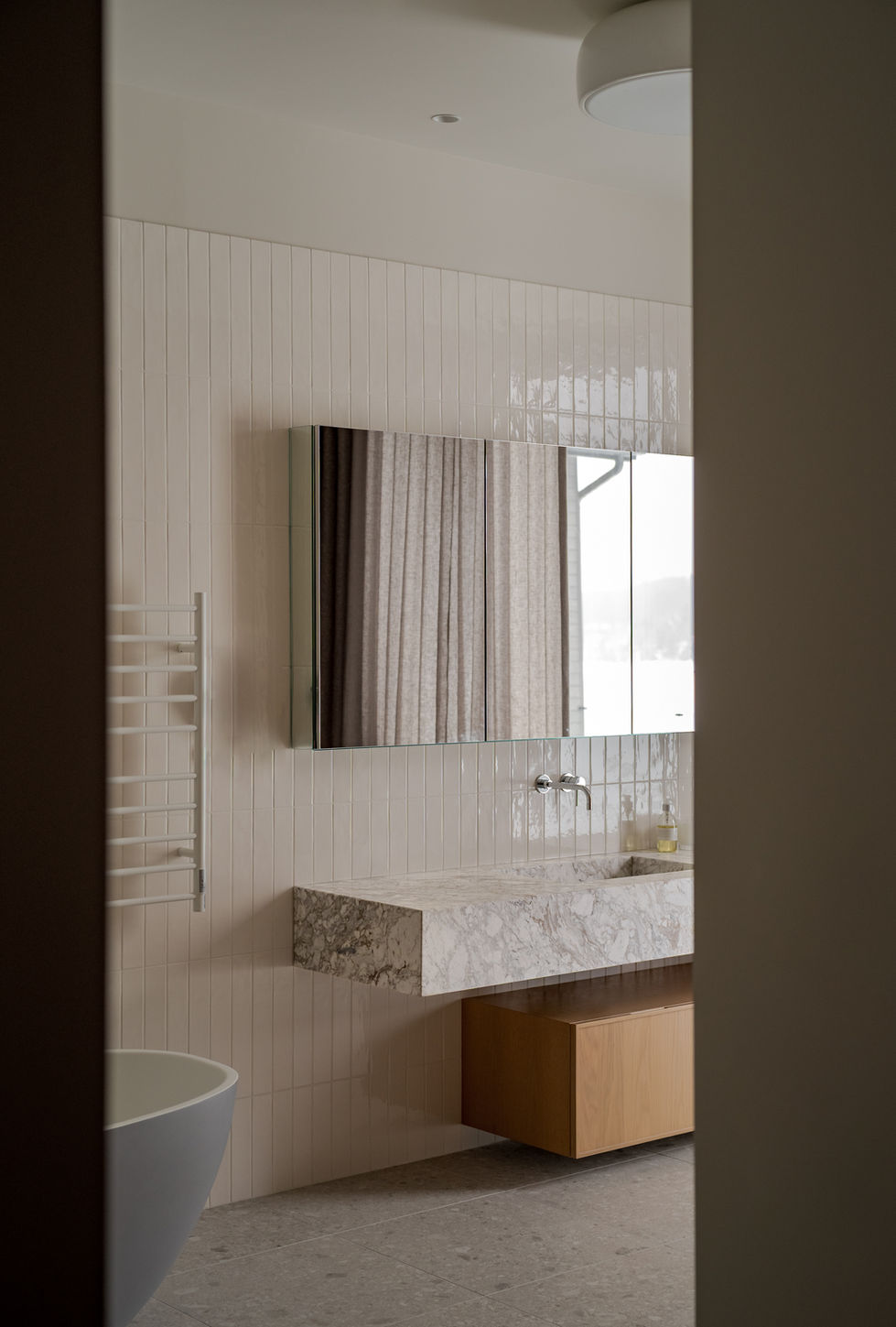 With a thoughtful mix of elevated finishes and warm, welcoming details, we added slatted wood accents to the already stunning kitchen and butler’s pantry, and introduced a marble-clad vanity with an integrated sink in the primary bathroom for a clean, timeless statement.